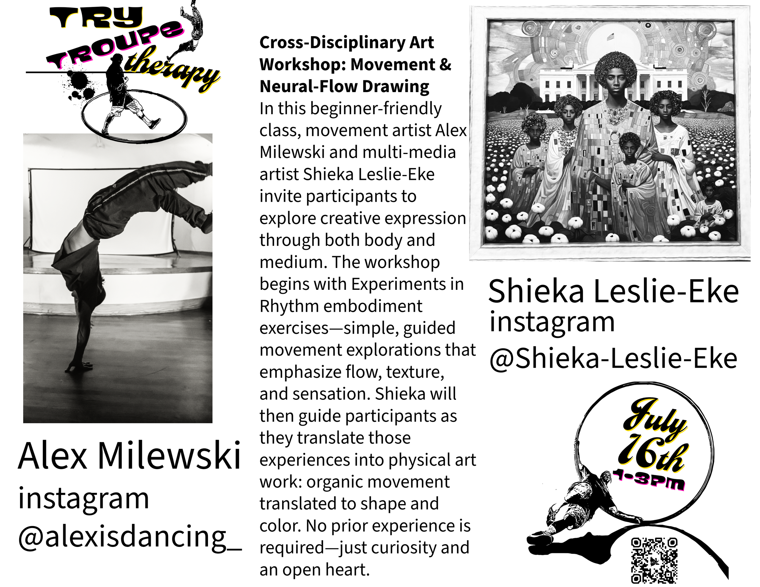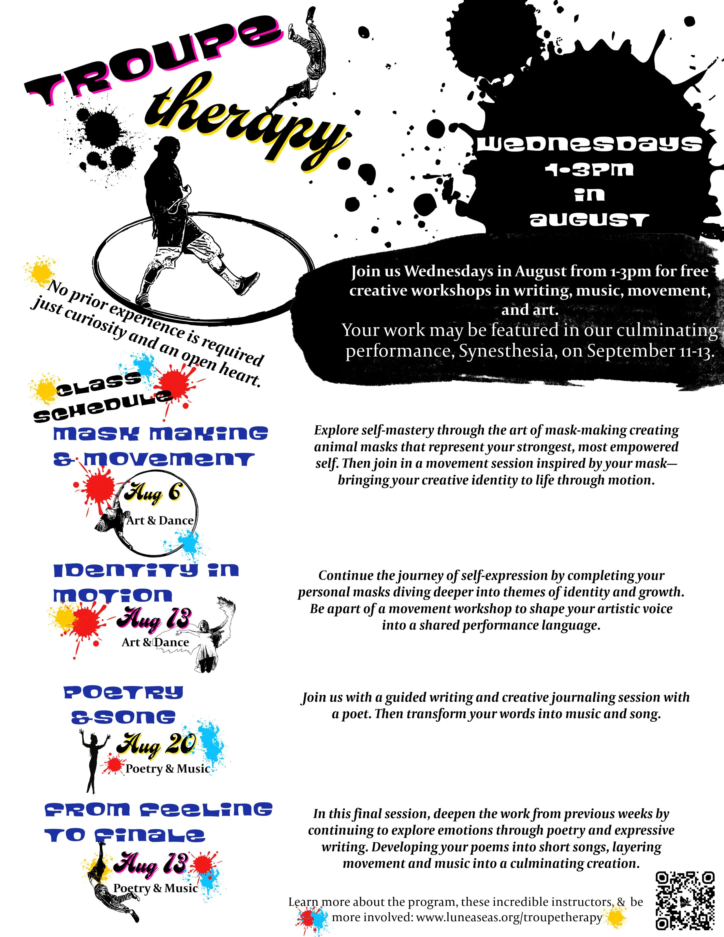 Troupe Therapy is a ground-up, cross-disciplinary artistic approach to mental health, using creative workshops that integrate visual art, dance, music, and storytelling. We intend to foster healing and collaboration by using creativity as a strategy for coping and treatment for those living with mental health conditions. Our facilitators—visual artists, dancers, poets, and musicians—will work together to inspire and teach peers in the community, addressing stigma while bringing understanding to the public about mental illness.